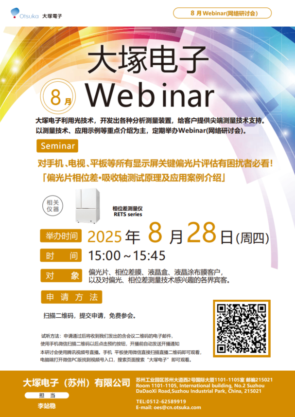 我們的產(chǎn)品涵蓋LED、OLED等光源和照明行業(yè),液晶和有機(jī)EL顯示的光學(xué)特性評估設(shè)備、測量半導(dǎo)體晶圓和薄膜厚度的設(shè)備,以及評估墨水、研磨劑、醫(yī)藥和化妝品材料的納米顆粒(粒徑和ζ電位)設(shè)備。